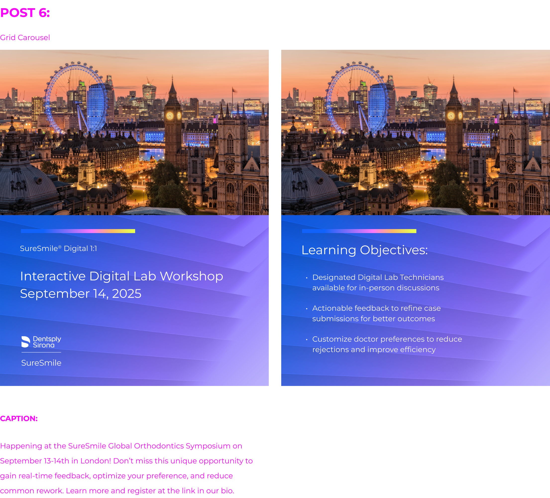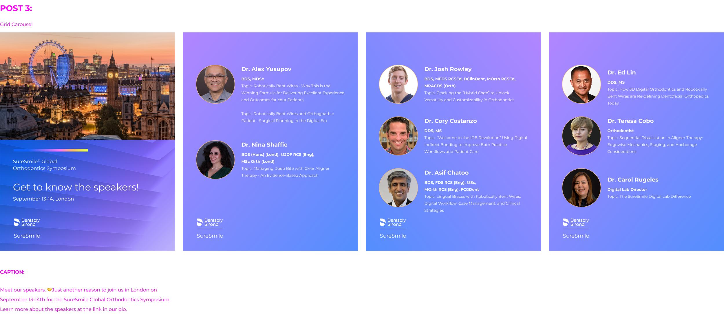 I worked with the SureSmile marketing team on these video and carousel ads for the SureSmile Global Orthodontic Symposium. Our embedded clinicians and Key Opinion Leaders each made videos encouraging fellow dental professionals to attend the Symposium. We edited the videos down to around 30 seconds each.